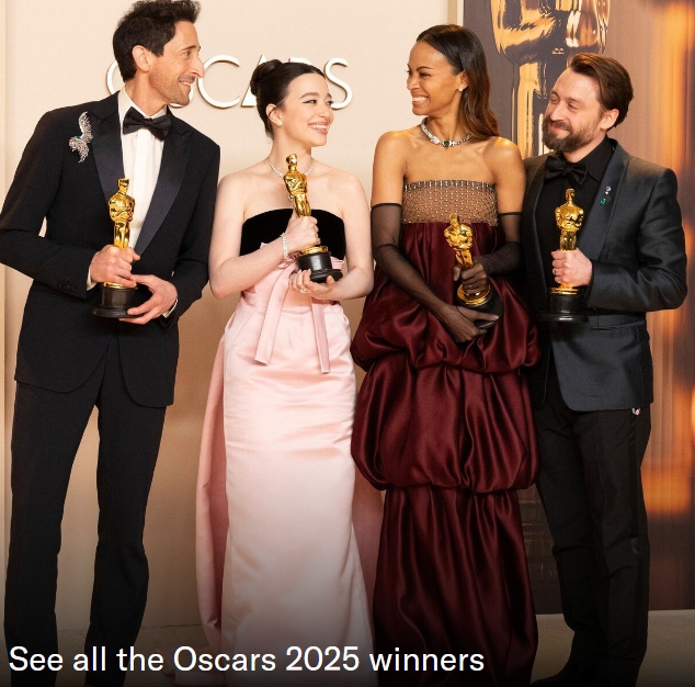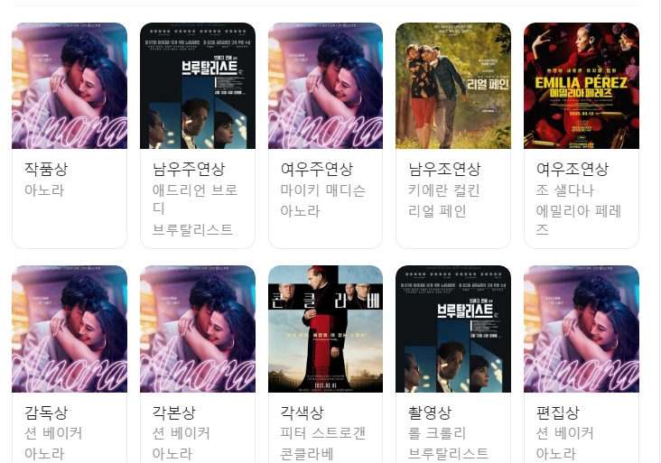 ▲작품상=아노라 ▲감독상=션 베이커(아노라) ▲여우주연상=마이키 매디슨(아노라) ▲남우주연상=애드리언 브로디(브루탈리스트) ▲남우조연상=키어런 컬킨(리얼 페인) ▲여우조연상=조이 살다냐(에밀리아 페레즈) ▲촬영상=브루탈리스트 ▲각본상=아노라 ▲각색상=콘클라베 ▲국제장편영화상=아임 스틸 히어 ▲의상상=위키드 ▲분장상=서브스턴스 ▲편집상=아노라 ▲음악상=브루탈리스트 ▲주제가상=에밀리아 페레즈 ▲미술상=위키드 ▲음향상=듄:파트2 ▲시각효과상=듄:파트2 ▲장편애니메이션상=플로우 ▲장편다큐멘터리상=노 아더 랜드 ▲단편영화상=나는 로봇이 아닙니다 ▲단편애니메이션상=사이프러스 그늘 아래 ▲단편다큐멘터리=온리 걸 인 더 오케스트라
